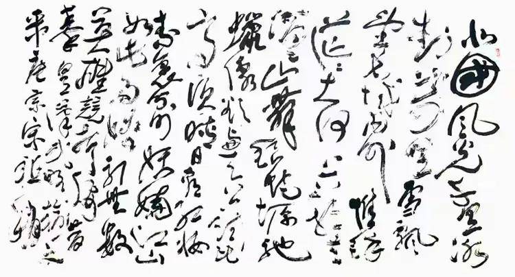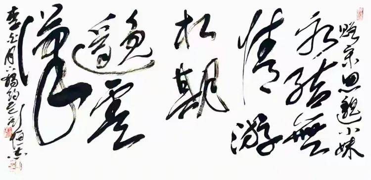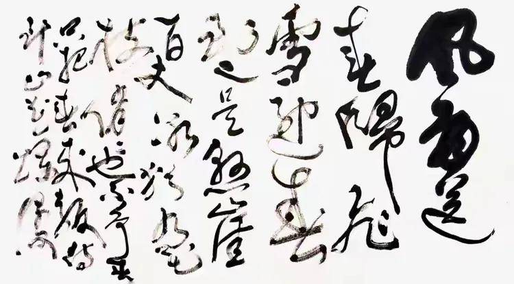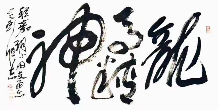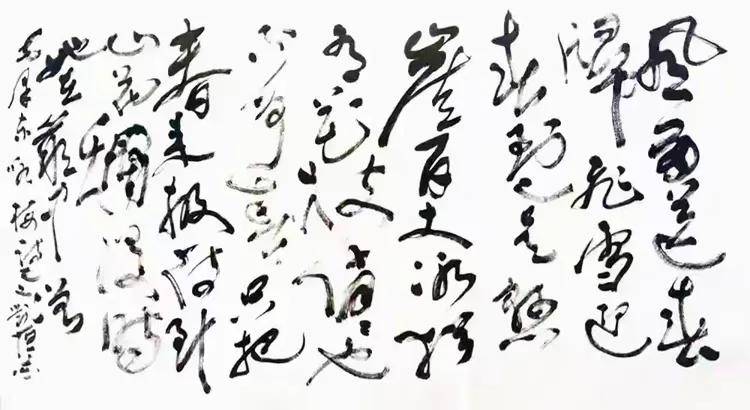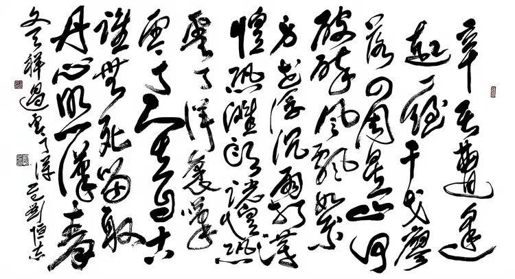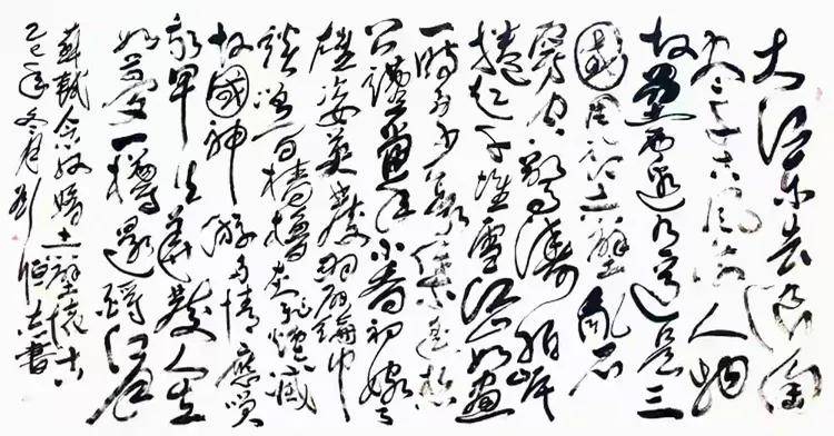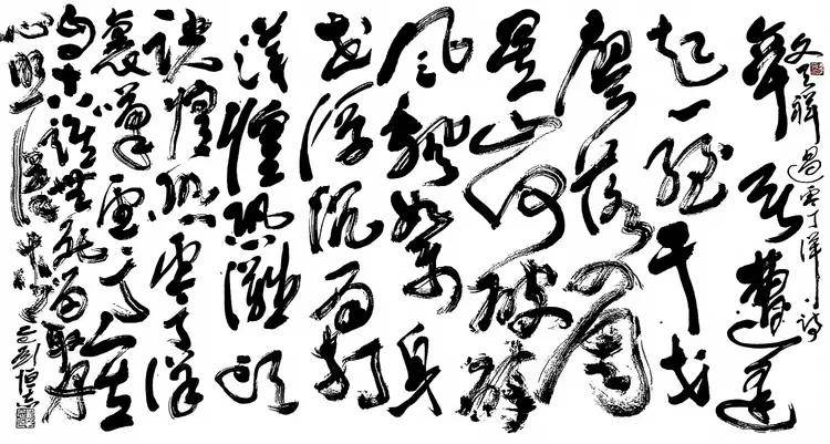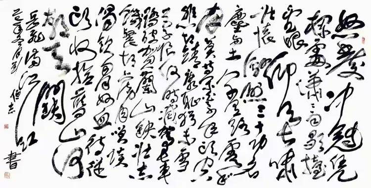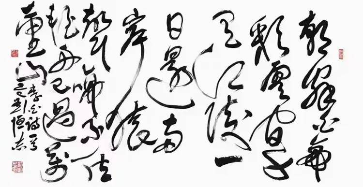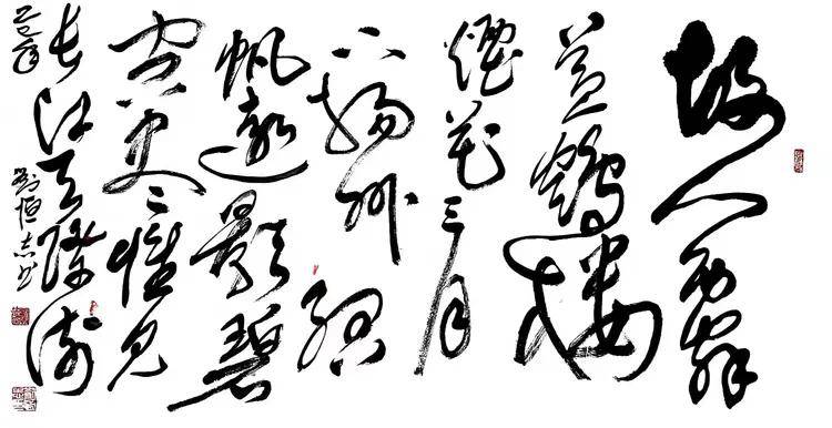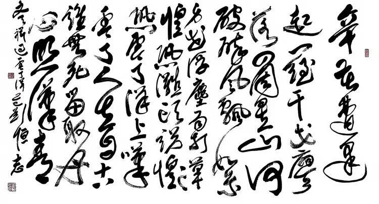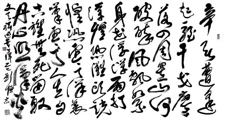 刘恒志教授笔下的草书作品堪称当代狂草的精品,通篇笔走龙蛇,气势磅礴。它的线条粗细变化极为丰富,时而重墨飞白如惊雷坠地,时而轻盈流转若游丝拂面,将草书“连绵缠绕、奔放不羁”的特质展现得淋漓尽致。